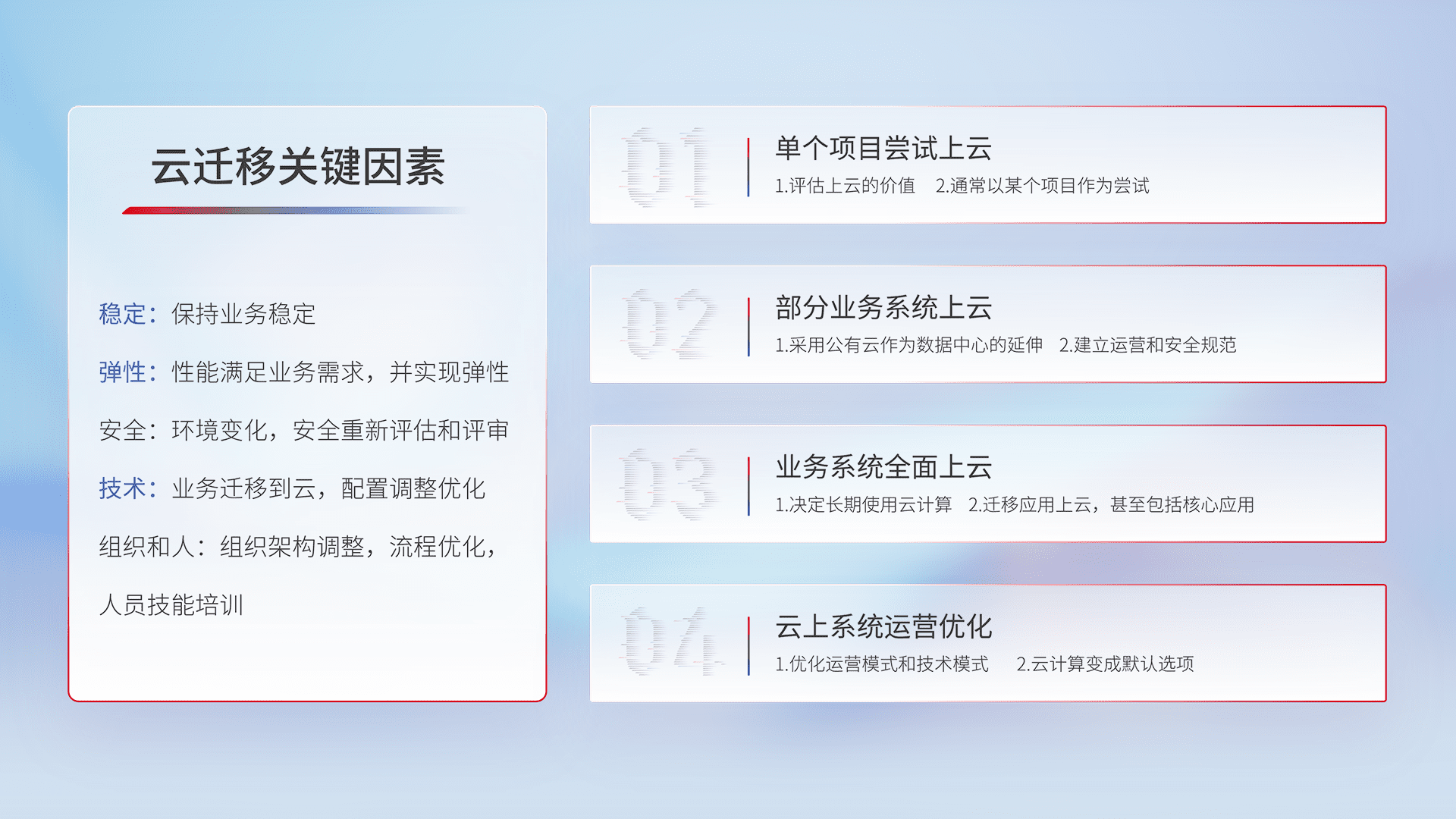 结合实际业务,,,,从规划设计、、、云平台选型、、云原生改造、、、、数据迁移、、、集成交付,,,,迁移全过程为客户识别最佳上云路径,,,,做好风险识别管理,,,,设计网络架构、、身份权限、、安全审计合规、、操作审计、、、、日志审计、、、、监控告警策略、、多站点容灾设计等,,,,对云上基础设施进行整体规划,,提升IT治理水平,,,,以满足弹性、、、高可用、、高性能的需求。。
