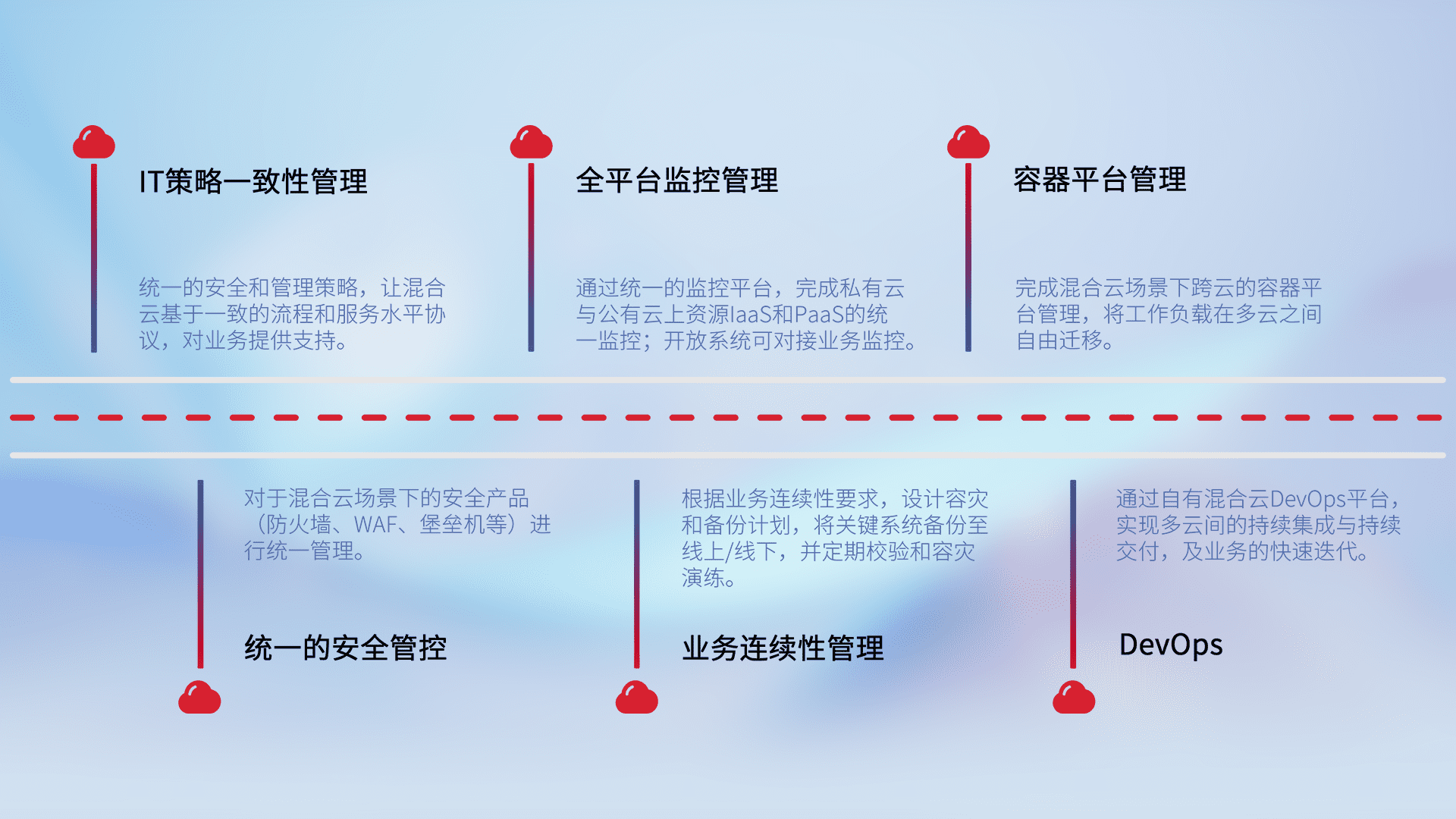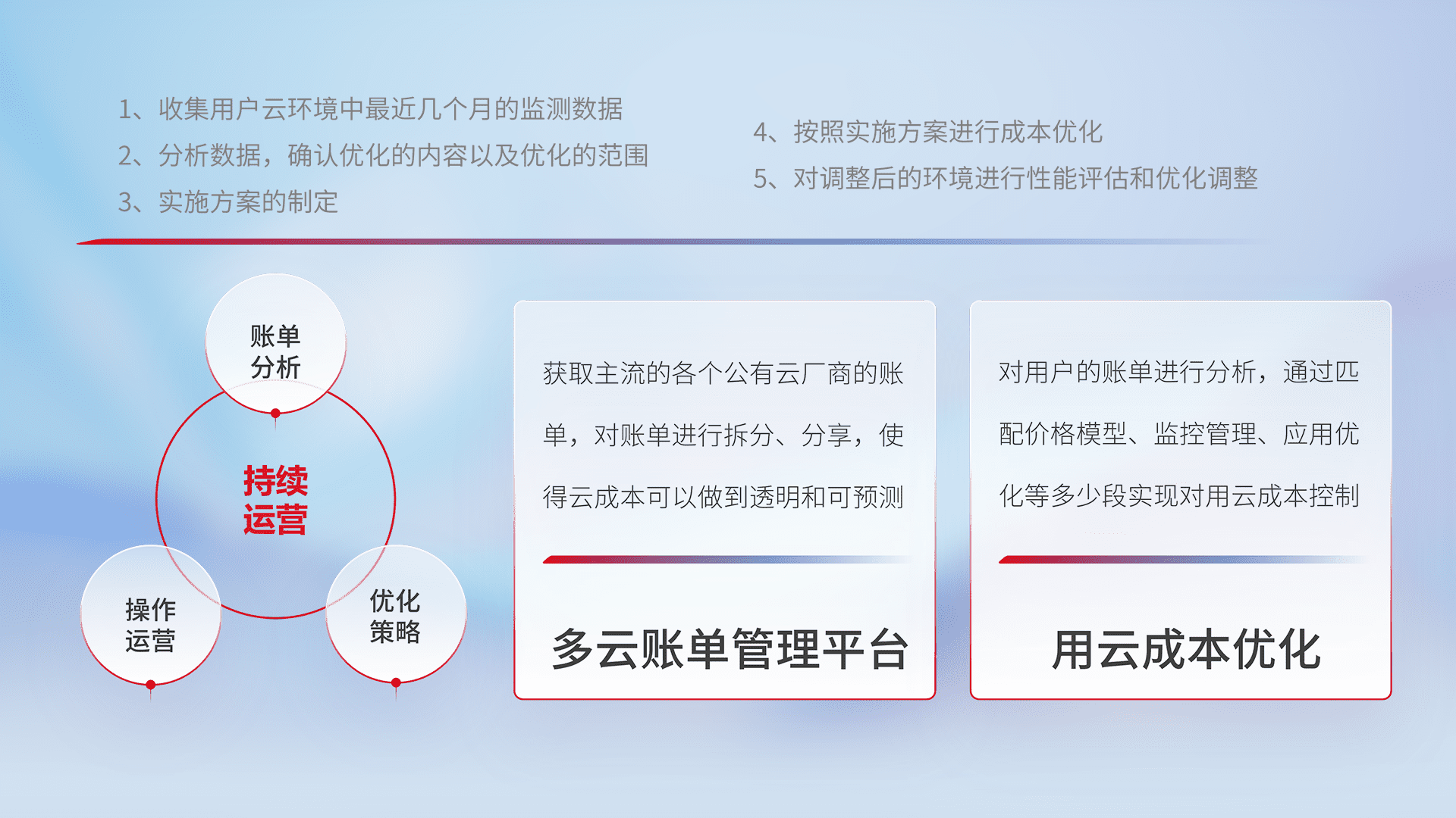 通过多云纳管,,,,以统一的资源数据模型把客户的云资源进行抽象和封装,,,进而实现对多云资源的统一操作,,,保障云资源管理的可靠性、、、稳定性与可用性。。。量身定制化运维内容,,,,配置、、、、开发运维、、补丁管理、、、备份、、监控、、、认证和访问管理、、、、审计和日常巡检等,,保障在用云过程中的可靠度,,,,稳定度以及高可用率。。
