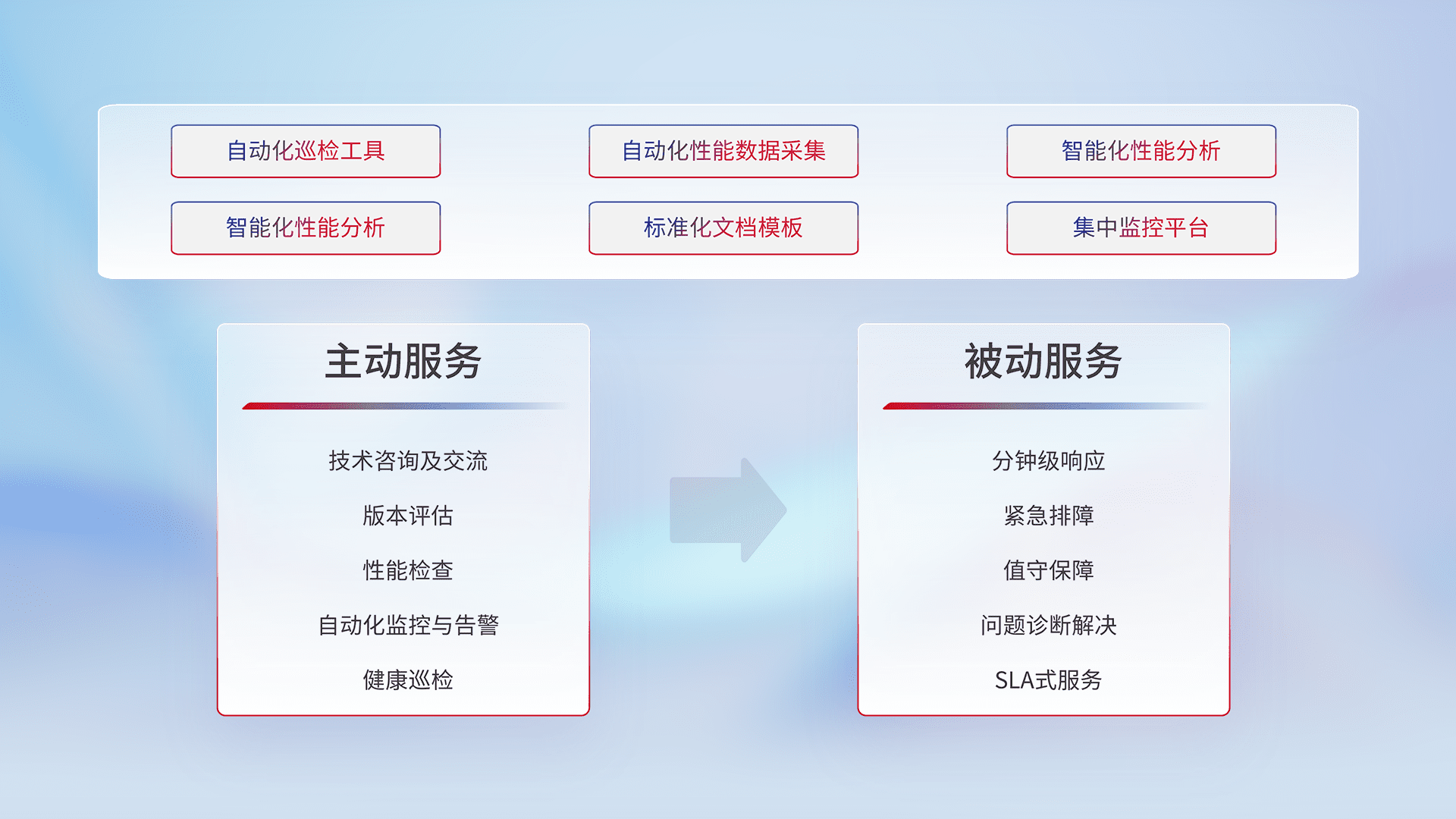 智能化工具和标准化文档,,保障服务质量,,,,提供主动服务(包含技术咨询、、、、版本评估、、性能检查、、、自动化监控与告警、、、健康巡检)和被动服务包含(分钟级响应、、、紧急排障、、、、值守保障、、问题诊断解决、、、、SLA服务)。。
